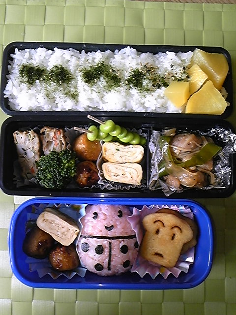 パパもお弁当を持参するようになったので二人分です なんちゃっててんとう虫弁当 こんなんでもチビ君は喜んでくれるから 作るのも楽しい♪ ここ最近は残さず食べて来てくれるから 幼稚園にも慣れて食べれるようになった? と思うと嬉しいO(≧∇≦)o 昨日は少ししか出来なかったベビー服の洗濯 今日は朝から3回洗濯機を回しました~! 後はおくるみと帽子を洗えば終了♪ でももう暑いし 退院時は車だから おくるみを使うかどうかだけど… 冷たい雨の場合もあるし念の為 今日もまた 茶色のおしるしがありました! 来週の検診前の出産になったりして♪ キタ―――――ッ!!!今日は銀行の用もあったのでお散歩がてら